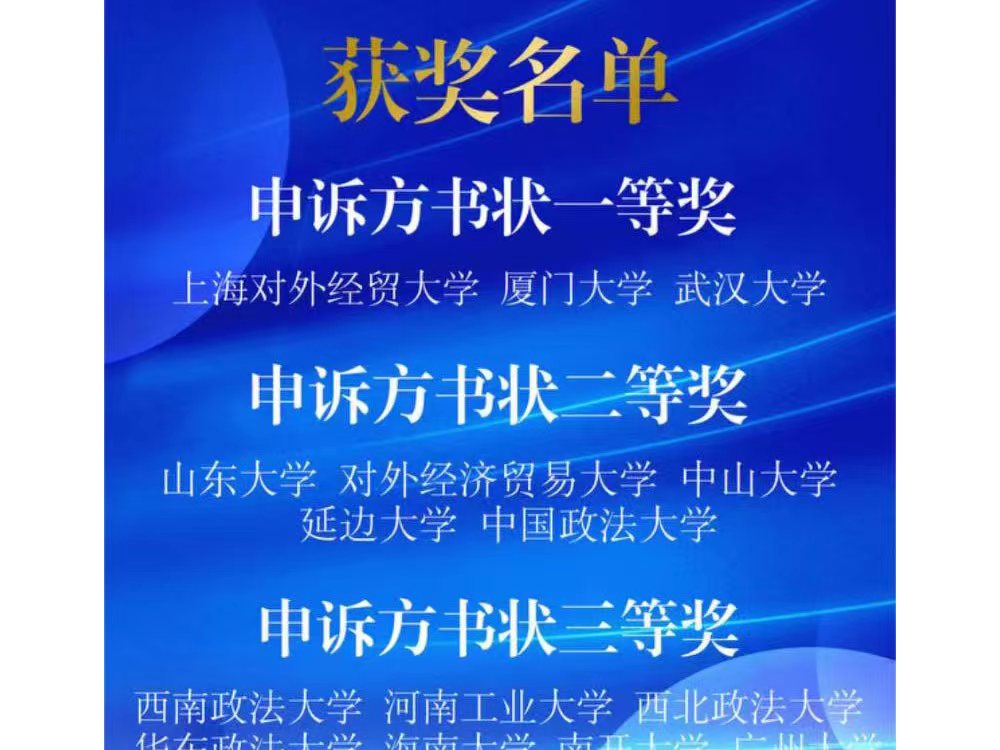 本届大赛由中国WTO模拟法庭竞赛组委会和西南政法大学共同主办,盈科律师事务所独家赞助。在本次比赛中,我校派出法学院金明子老师担任指导教师,法学院2021级闻菲阳、2021级赵靖、外国语学院2021级张弘喆、法学院2020级张曦月四名同学组成的延边大学代表队参加了竞赛。我校代表队虽首次参加中国WTO模拟法庭竞赛,在两轮的激烈角逐后荣获本次竞赛二等奖和申诉方最佳书状二等奖的优异成绩。