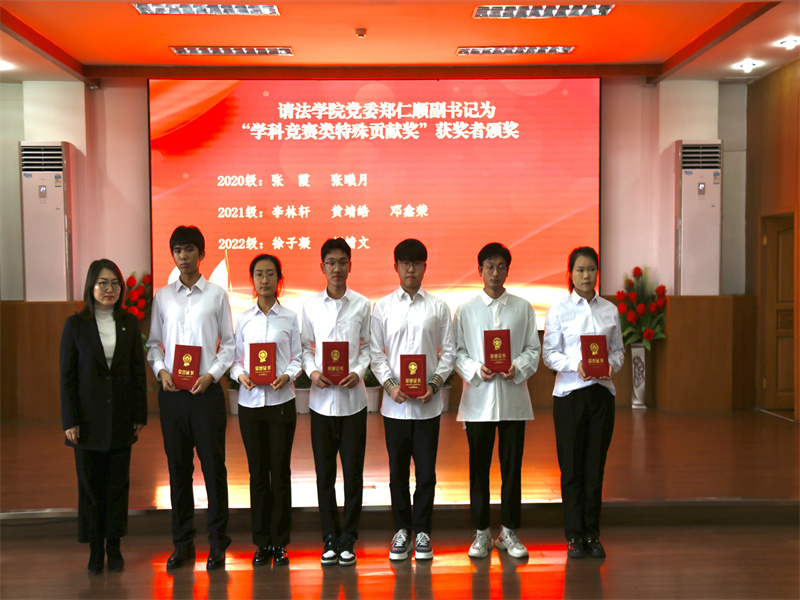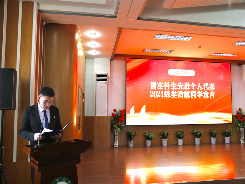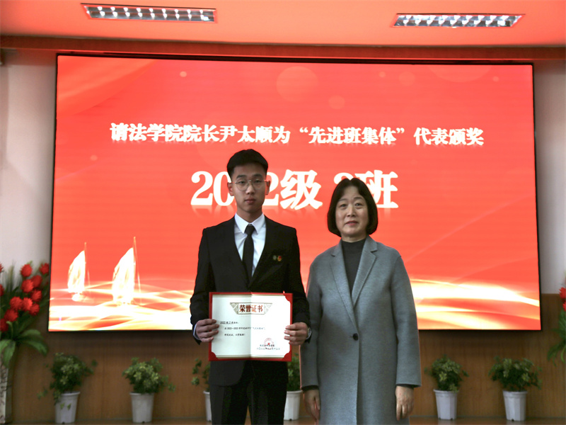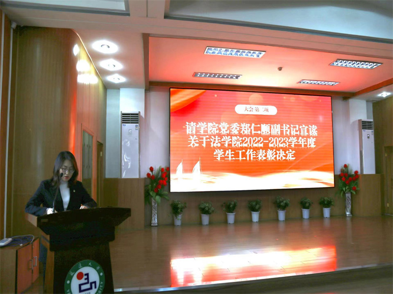 会议在庄严的国歌中来开帷幕,党委副书记郑仁顺老师宣读表彰决定,对2022-2023学年评选出的“先进班集体”“三好学生”“优秀研究生”“优秀学生干部”“优秀研究生干部”“学科竞赛类特殊贡献奖”“优秀志愿者特殊贡献奖”“法律职业资格考试学习标兵”获得者进行表彰,并由莅临本次大会的领导老师向获奖集体和个人进行颁发荣誉证书和奖品。随后,2021级牟浩航同学代表本科先进个人发言;2021级张美玲同学代表研究生先进个人发言,他们对法学院领导老师的悉心栽培表达了由衷的感谢并表示会以身作则、再创佳绩。