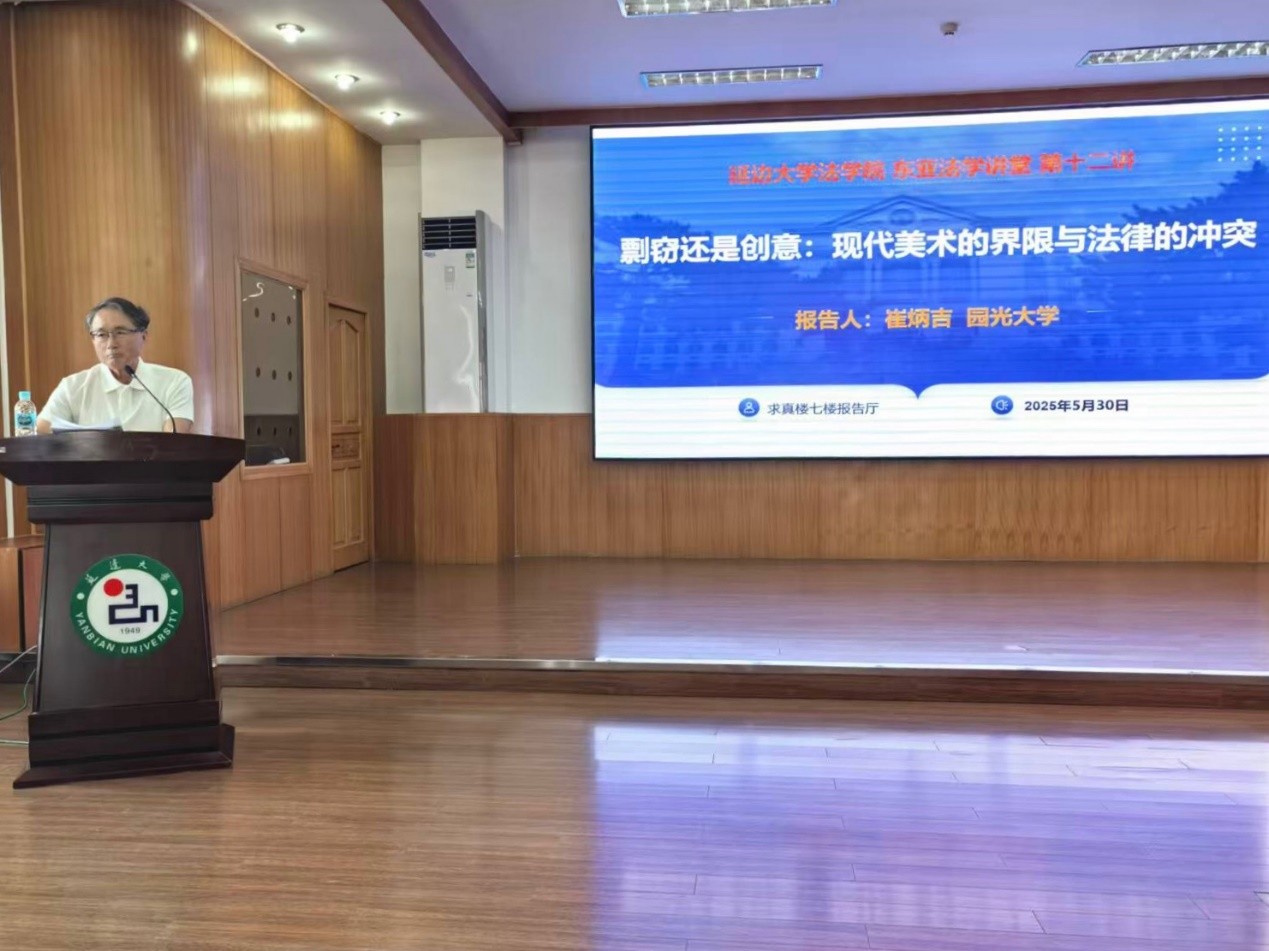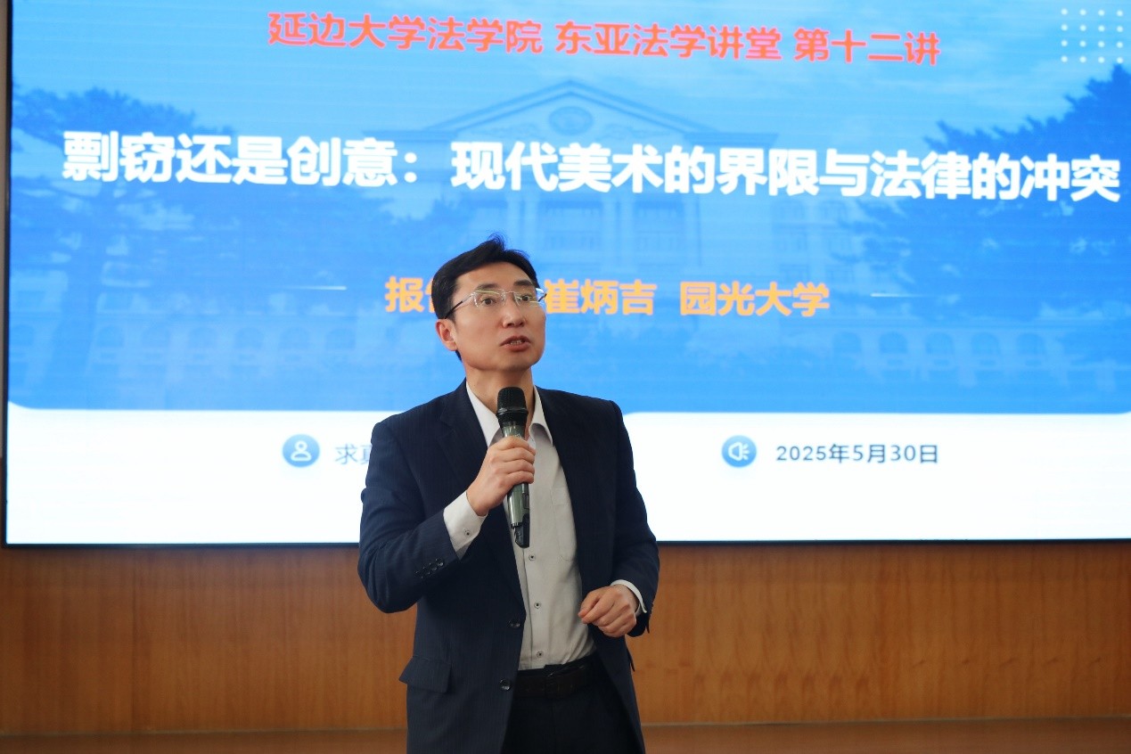 2025年5月30日,必赢线路检测3003no1在求真楼七楼报告厅举办《东北亚法学讲堂》第十二讲“剽窃还是创意:现代美术的界限与法律的冲突”。学院特邀圆光大学客作教授崔炳吉作讲座,由法学院副院长康贞花主持,由2024级宪法学与行政法学研究生卢敏宇、刑法学研究生崔佰利进行翻译。